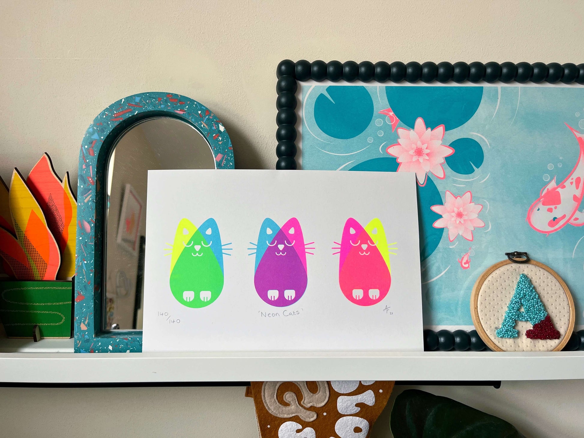 These colourful cats are an A4 Risograph print with three layers of colour; florescent yellow, florescent pink and aqua.